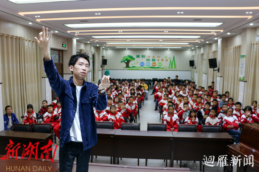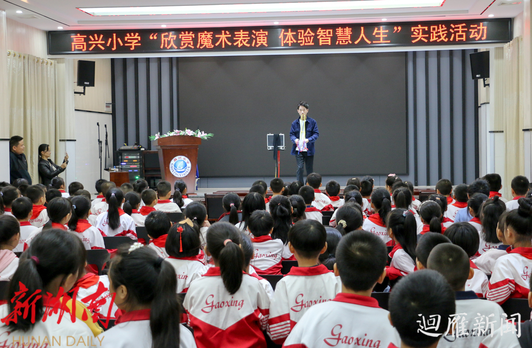 火红的木棍,用手一搓变成了黑白相间,再用手一撸,木棍竟变成了彩色的丝巾;明明是一张餐巾纸经过反复折叠,变成了彩色布条;撕碎的报纸经过揉捏,竟然神奇的复原了…… 今日下午,衡阳晚报小记者俱乐部邀请魔术师阳祖林,为雁峰区高兴小学的衡阳晚报小记者们带来了精彩的魔术表演,让孩子们近距离感受魔术的神奇魅力。