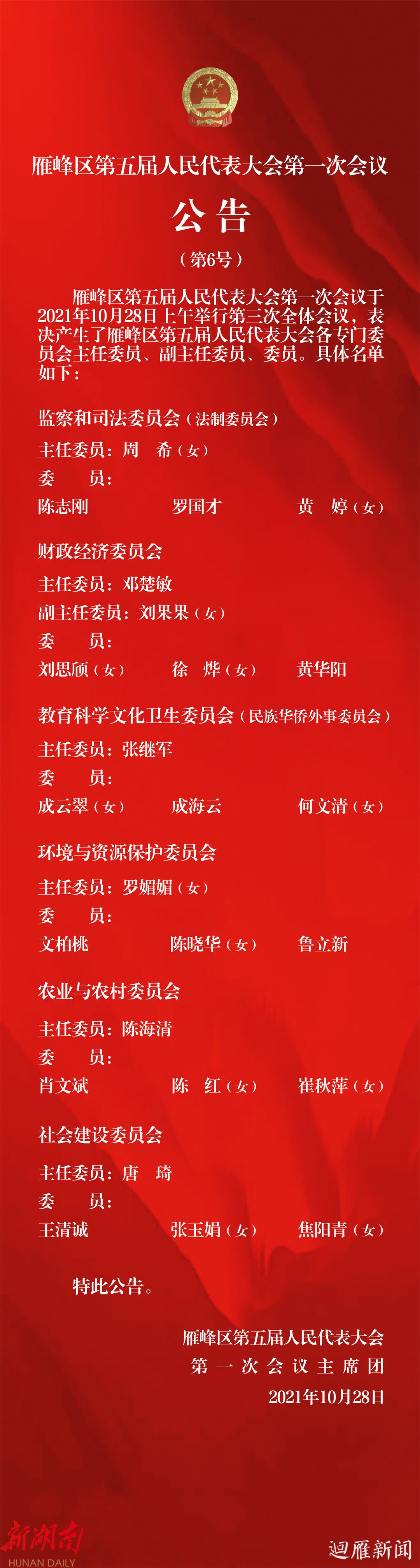公告|雁峰区第五届人民代表大会各专门委员会主任委员、副主任委员、委员名单
