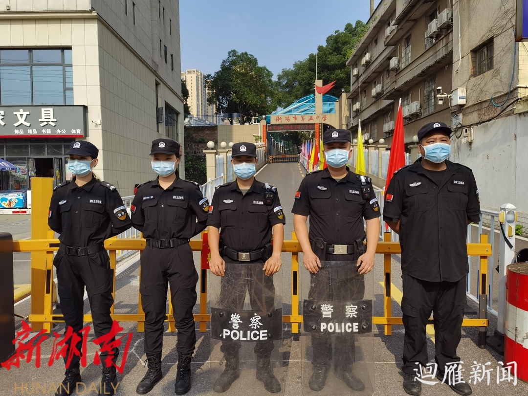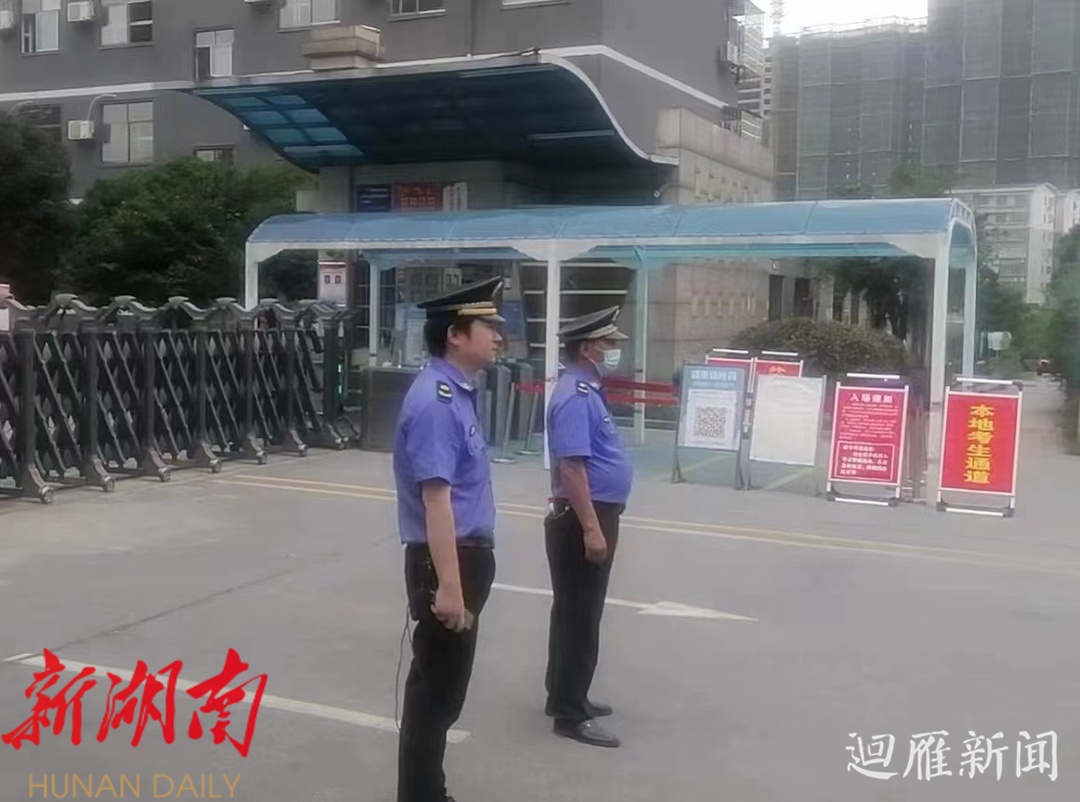 ▲雁峰城管执法人员在衡阳市职业中专执勤