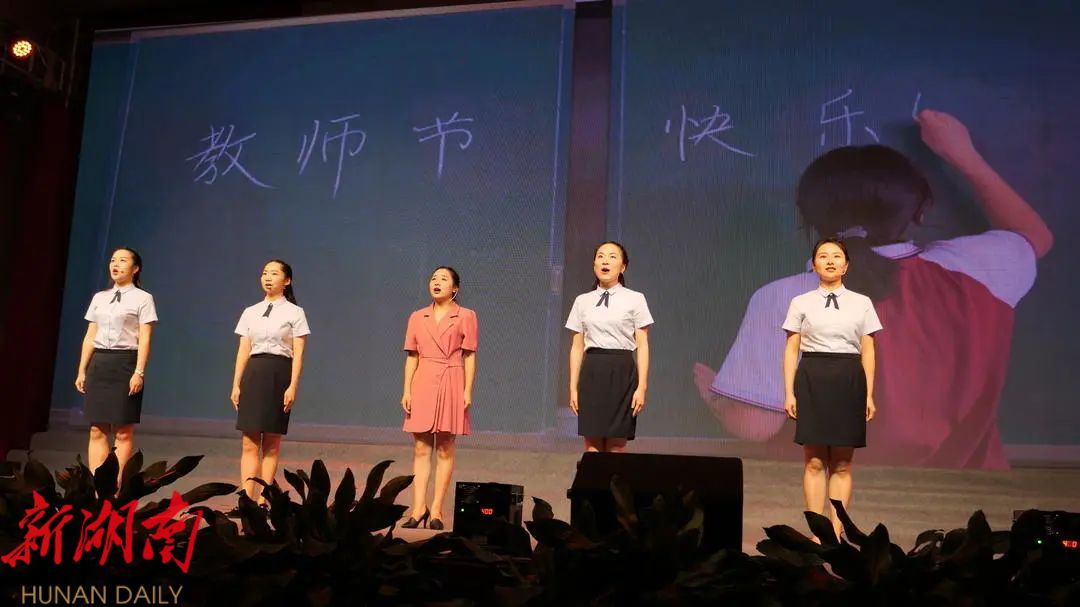 晚会在合唱《我爱米兰》《每当我走过老师窗前》中拉开序幕。整场晚会分为七个篇章,首先通过情景式朗诵讲述了师德标兵陈玉竹的感人故事。从教以来,陈玉竹一直奋战在教学第一线,潜心教研,关爱学生,是同学们心中的好老师。优秀班主任肖亚玲也走上舞台讲述了她和孩子们的故事。“长大后我就成了你,才知道那个讲台举起的是别人,奉献的是自己...”优秀教育工作者熊虎的学生倾情演唱《长大后我就成了你》道出自己无尽的感恩与怀念。市级最美乡村教师汪爱华、桑植一中校长王兴辉、启智学校校长钟培生的故事也令人动容。一个个精彩的节目,赢得了现场阵阵掌声,让观众感受到了新时代教师的理想情操和师德风范。