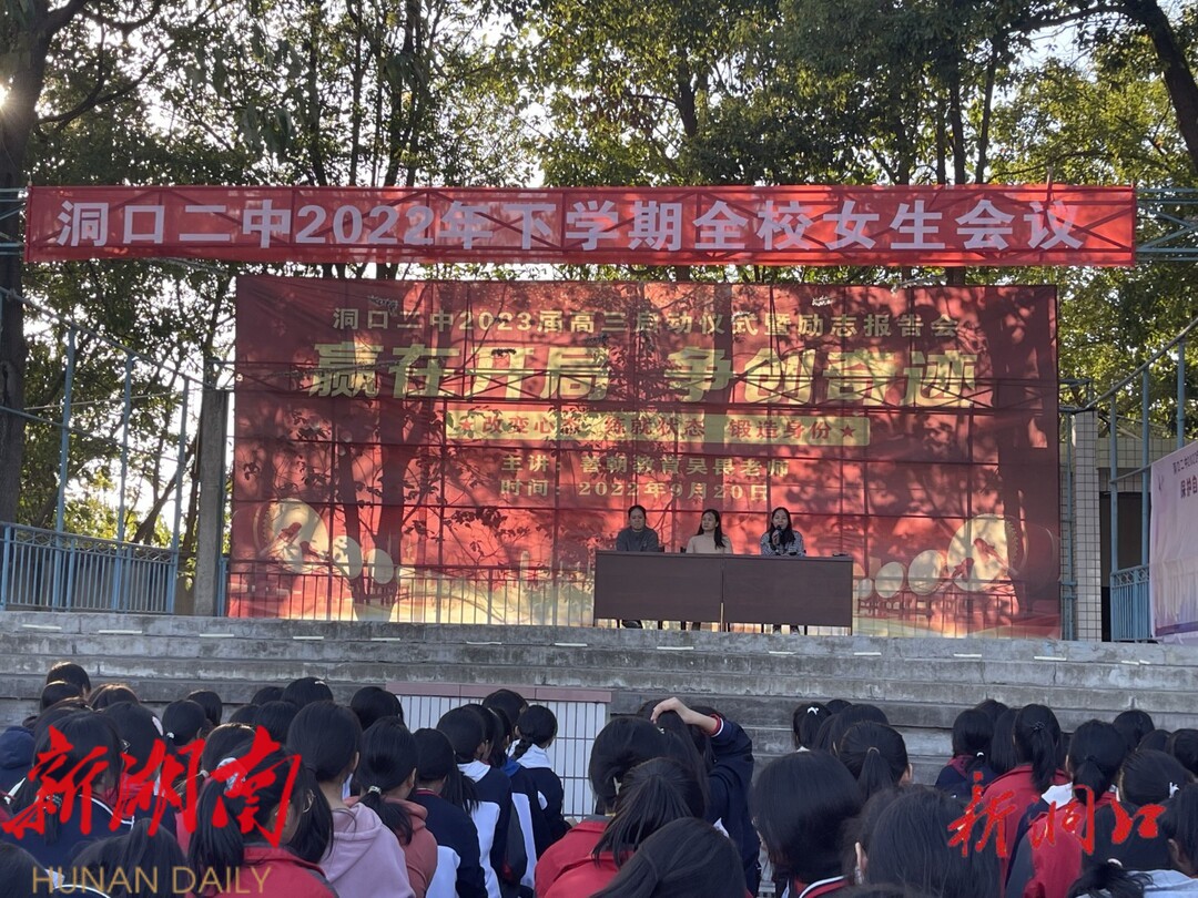 会上,洞口二中心理教师周华英围绕“对异性产生好感怎么办”问题,给同学们提出了“不妨想想我们现在生活的重心”建议,引导同学们正确平衡学业和青春期懵懂的感情。洞口二中德育处主任王爱姣作了题为“提高安全意识,保护身心健康,活出自我风采”的精彩演讲,引用真实案例,详细讲解了最常见的女生安全事故,教导女生们提高警惕,强化自我保护,正确应对危害生命安全的紧急情况。