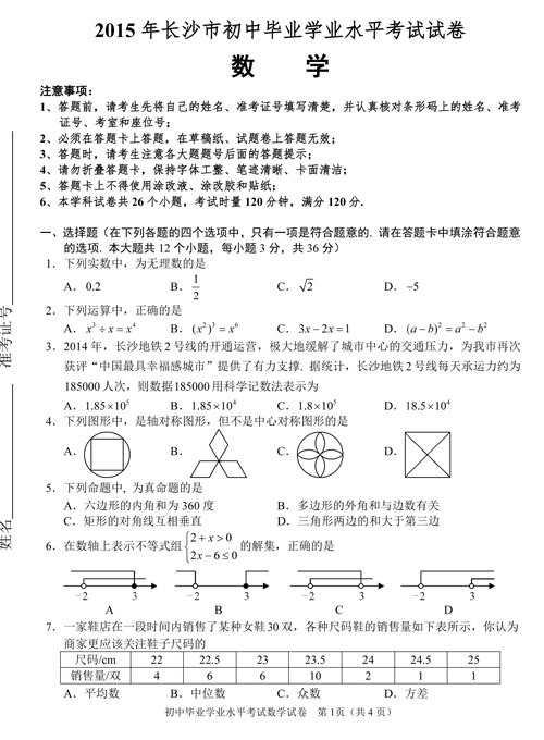 以下是2015长沙中考数学A卷试卷及参考答案: