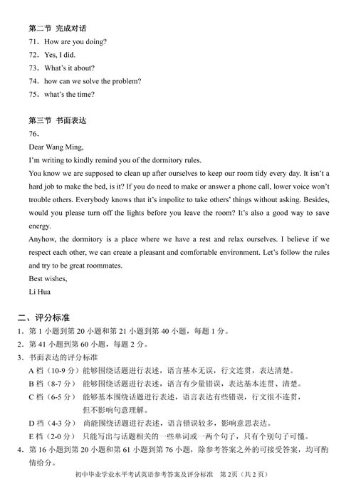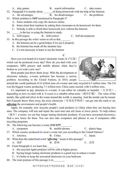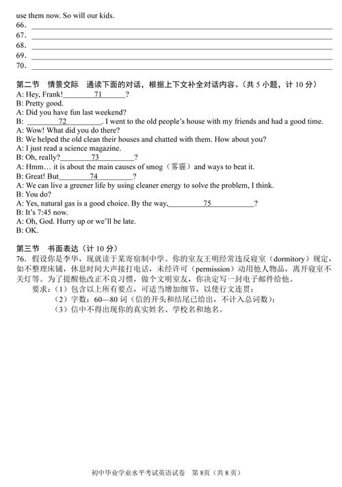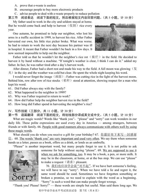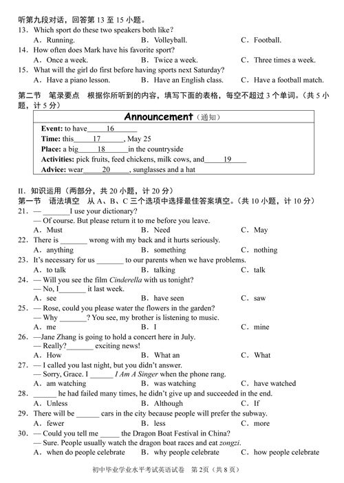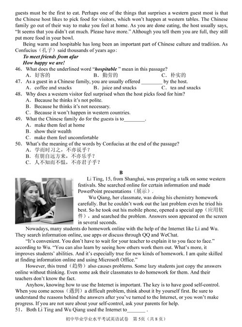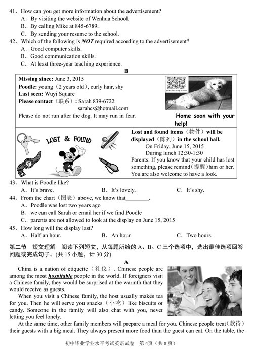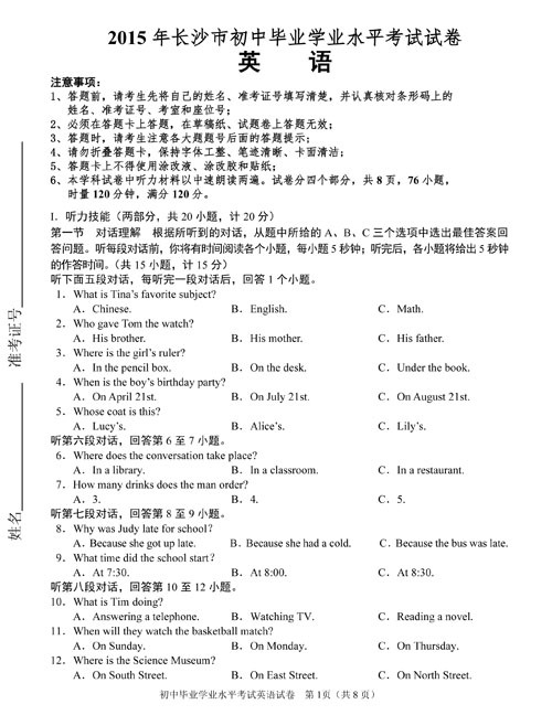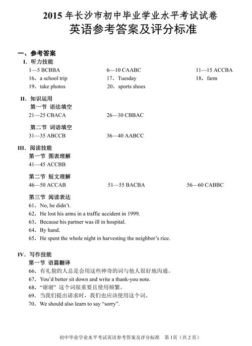 以下是2015长沙中考英文A卷试卷及参考答案: