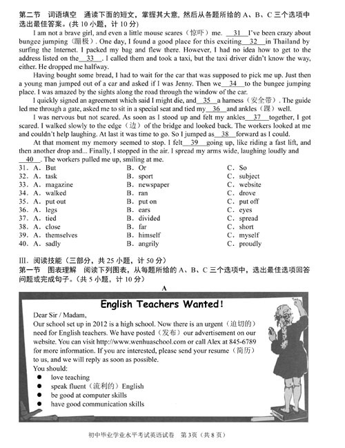 英文A卷丨无线湖南权威发布2015长沙中考试卷答案