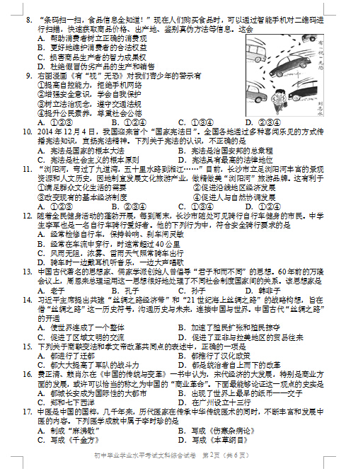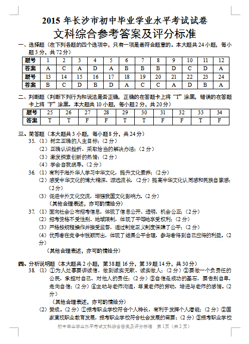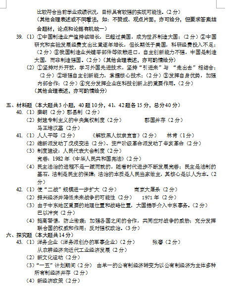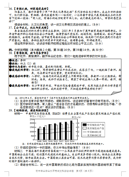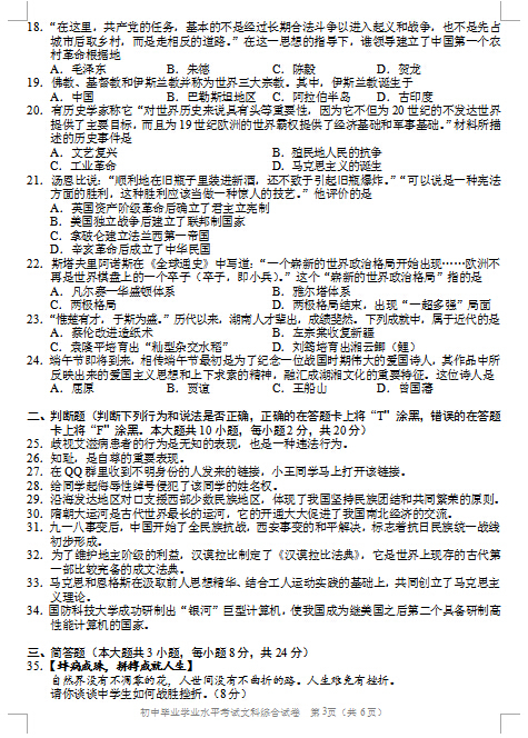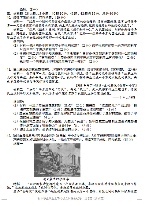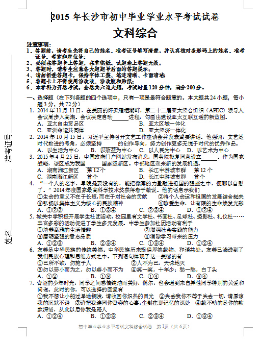 文科综合丨无线湖南权威发布2015长沙中考试卷答案