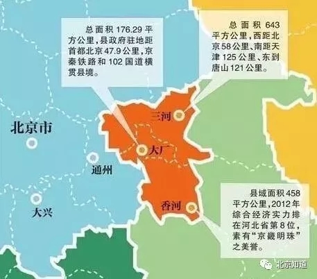 △通州与廊坊北三县地缘位置图。