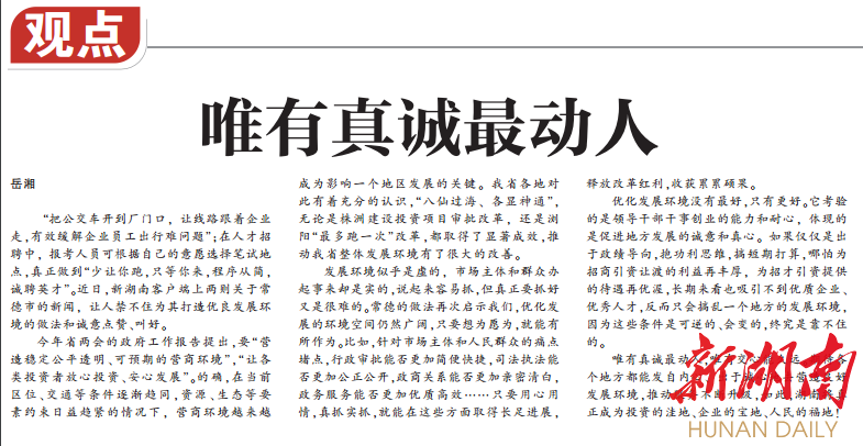 常德市“暖企”实招不断,有力促进了企业发展。由市农委牵头的“常德品牌 中国品质”常德品牌农业推介活动,继长沙站活动之后,于2月初带领100余家企业、300余个名优农产品参加了深圳站的推介活动,现场签约65个项目,购销额近100亿元。2月7日,本报以《唯有真诚最动人》为题的短评,为常德“暖企”行动点赞。