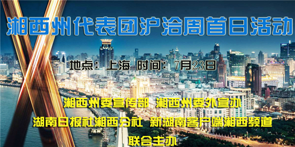 7月23日至27日,湖南省人民政府在上海市举办2018年湖南—长三角经贸合作洽谈周(简称沪洽周)。湘西土家族苗族自治州组团参加本届沪洽周,旨在深入贯彻落实党的十九大精神,抢抓新一轮改革开放机遇,落实国家长江经济带发展战略,以战略性新兴产业和现代服务业为重点,以精准、务实、创新、节俭为基本原则,进一步强化合作共赢理念,通过高层交流、专场推介、团组招商、精准对接和项目洽谈等方式,多渠道推介湘西州投资环境和招商项目,进一步扩大“神秘湘西”在长三角地区的知名度和影响力。今天是沪洽周的第一天,新湖南客户端对湘西州在上海的首日活动进行现场直播。