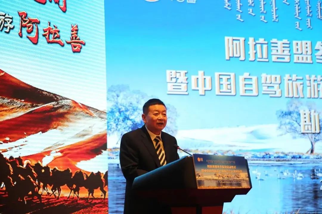 中国自驾旅游产业联合会主席杨国林、阿拉善盟文化旅游广电局局长孙建军等领导共同按下启动球,阿拉善盟冬季旅游启动仪式暨中国自驾旅游产业联合会走进阿拉善勘线活动发车仪式启动。