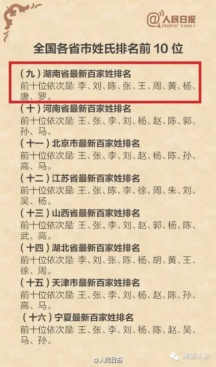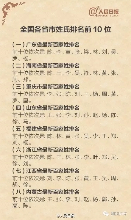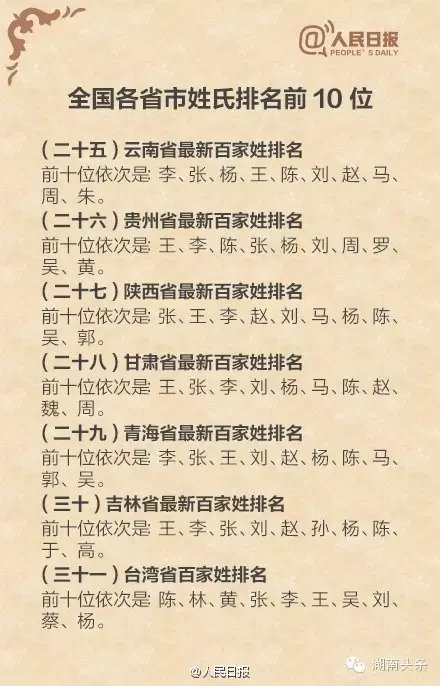 下面是全国各省排名前十位的姓氏