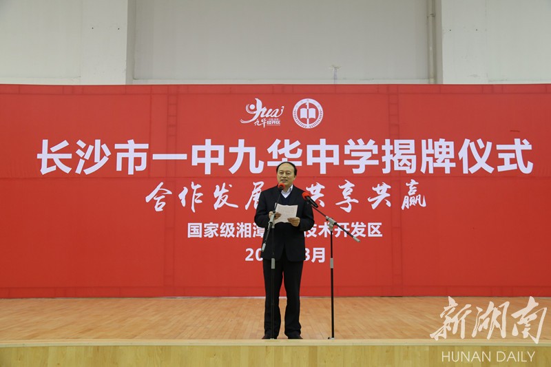 湖南日报3月15日讯(记者 曹辉 蒋睿 通讯员 朱达) 今天上午,湘潭经开区管委会与长沙市一中合作办学揭牌仪式在九华中学举行,长沙市一中九华中学盛装起航。省教育厅党组书记、厅长肖国安,省教育厅党组成员、副厅长王建华;湘潭市委副书记、市人民政府市长谈文胜,市人民政府副市长刘永珍,湘潭经开区党工委书记孙银生,市人民政府秘书长赵新文,市人民政府副秘书长刘定良;湘潭市教育局党委书记、局长陈利文;长沙市一中校长廖德泉,长沙市一中副校长宋建平、副校长冯建强、办公室主任程萃,长沙市一中九华中学校长罗烈;湖南悦海实业集团有限公司董事长朱日晖出席揭牌仪式。