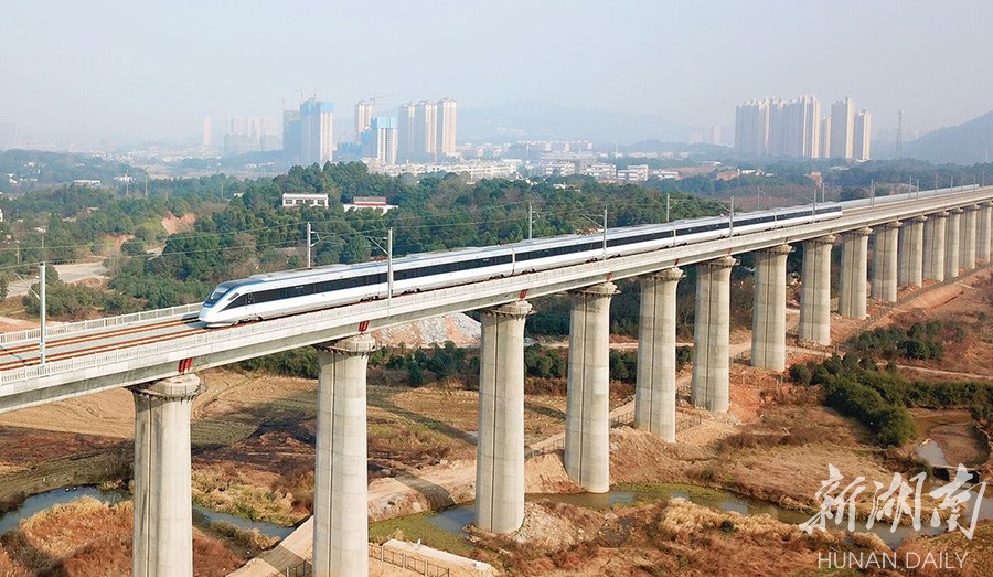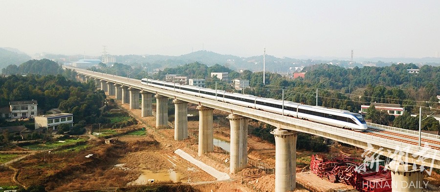 12月26日,株洲南至长沙西的C7839次城际列车行驶在长株潭城际铁路西延线长沙绕城高速特大桥上。