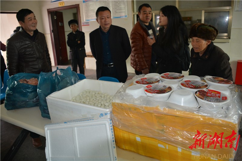 2月11日,在镇党委与村委主要负责人的陪同下,浏阳市镇头镇跃龙村的罗姓村民们给敬老院80位老人送去大量扣肉、鸡鸭和鹌鹑蛋等。