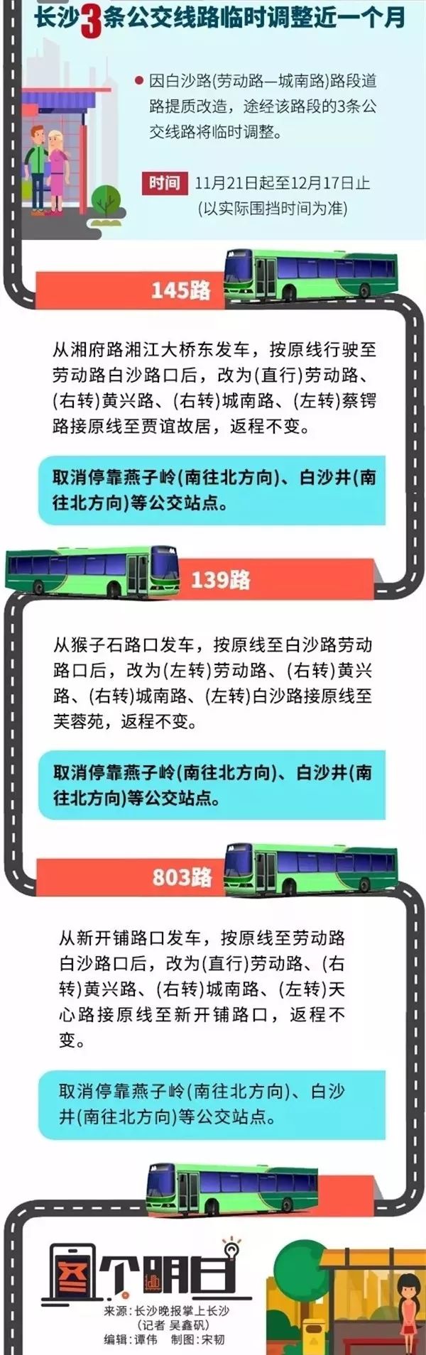 从新开铺路口发车,按原线至劳动路白沙路口后,改为(直行)劳动路、(右转)黄兴路、(右转)城南路、(左转)天心路接原线至新开铺路口,返程不变。取消停靠燕子岭(南往北方向)、白沙井(南往北方向)等公交站点。