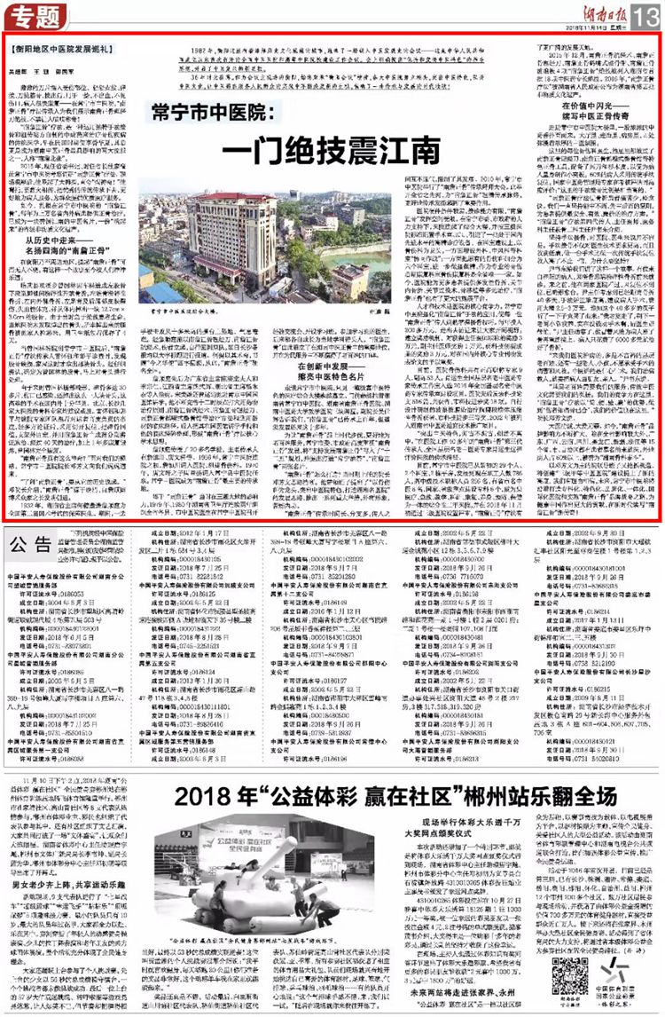 走进常宁市中医院,只见一幢极富中医特色的医疗综合大楼巍然矗立。门前赫然挂着湖南省常宁市中医院、湖南省南詹正骨医院、湖南中医药大学教学医院三块牌匾。副院长吴仕辉告诉我们,“南詹正骨”已传承上百年,但蓬勃发展还属这十多年。