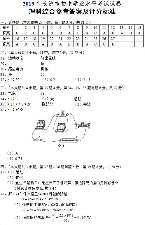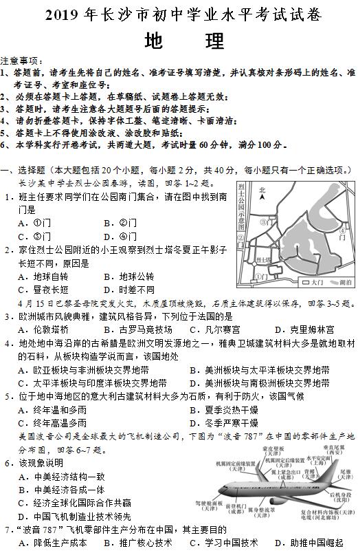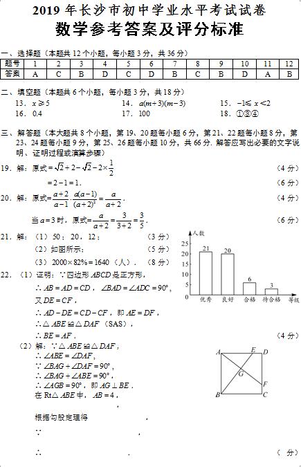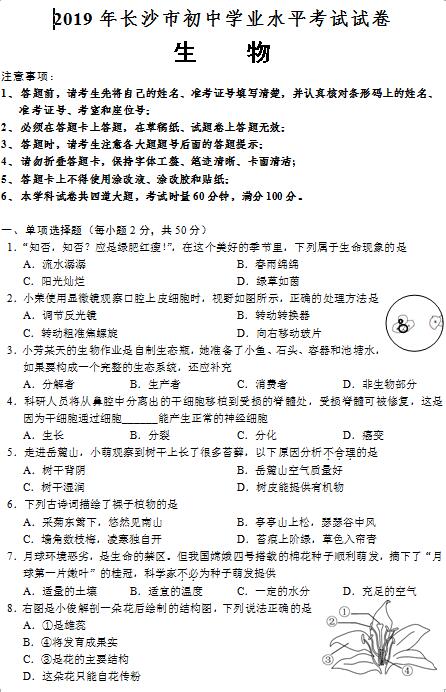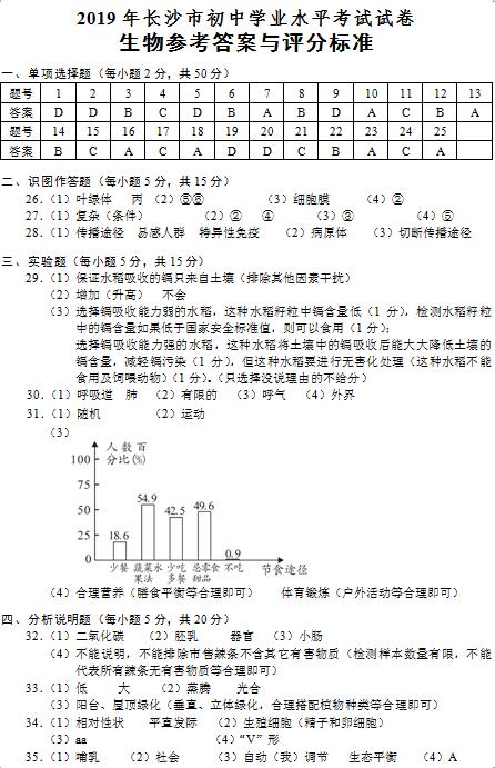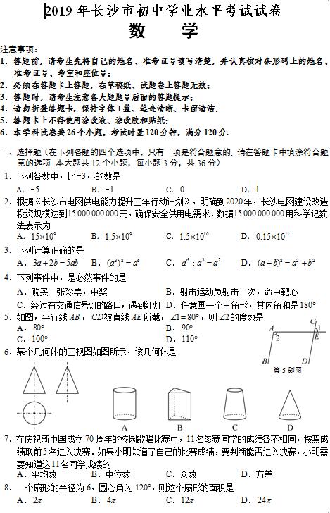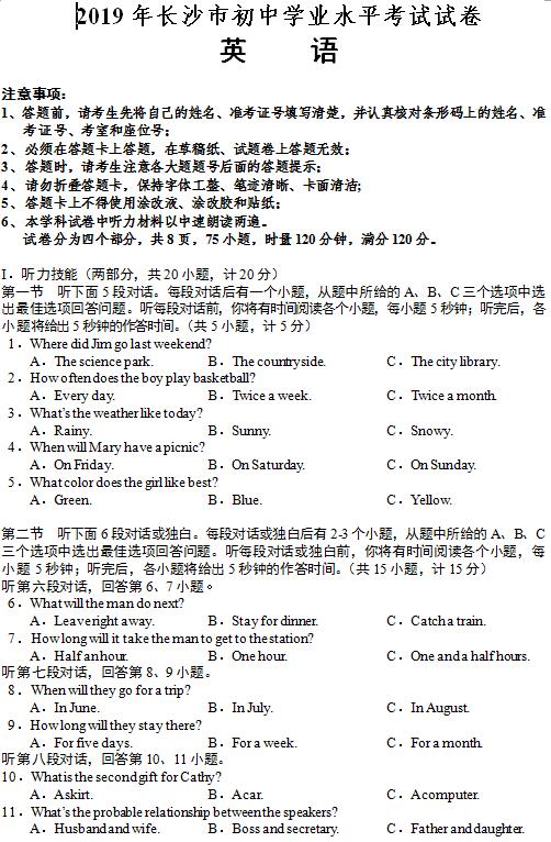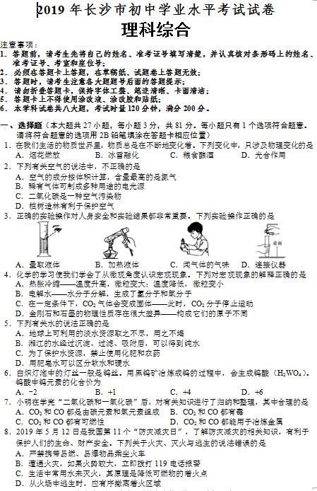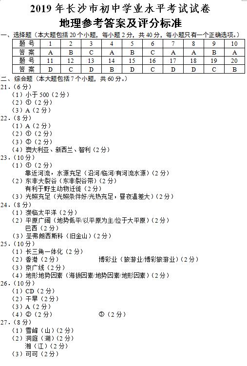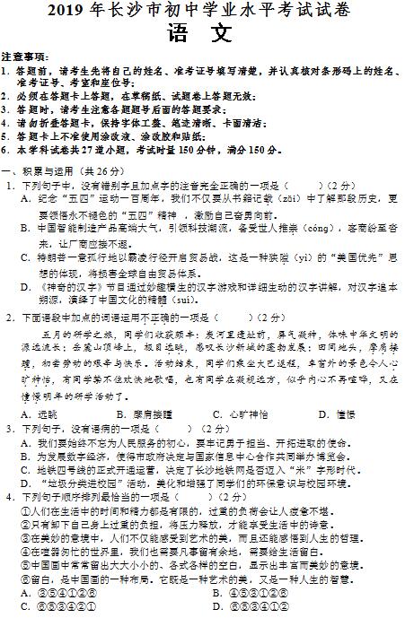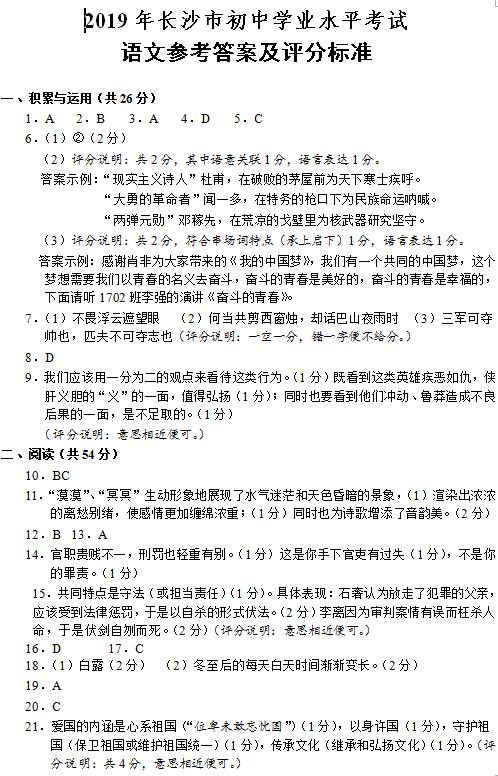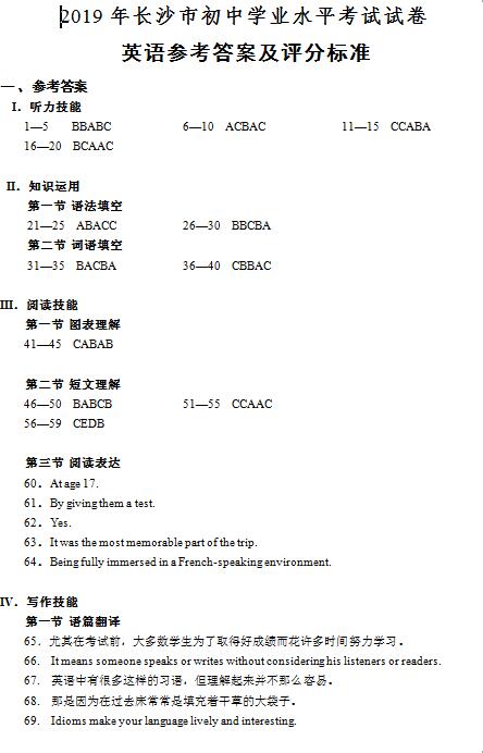 2019年长沙市中考试卷及参考答案公布
