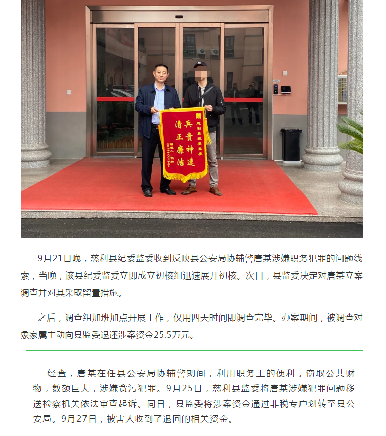 该公号9月29日发布了一篇名为“县监委4天查结职务犯罪案 退还群众资金25.5万元”的文章,该文章写道:“谢谢你们为我这件事劳累奔波,连夜就展开调查,还帮我追回了这笔钱,作为一个外地人,能得到你们的帮助,我很感动,你们真是我们老百姓的忠诚卫士......”