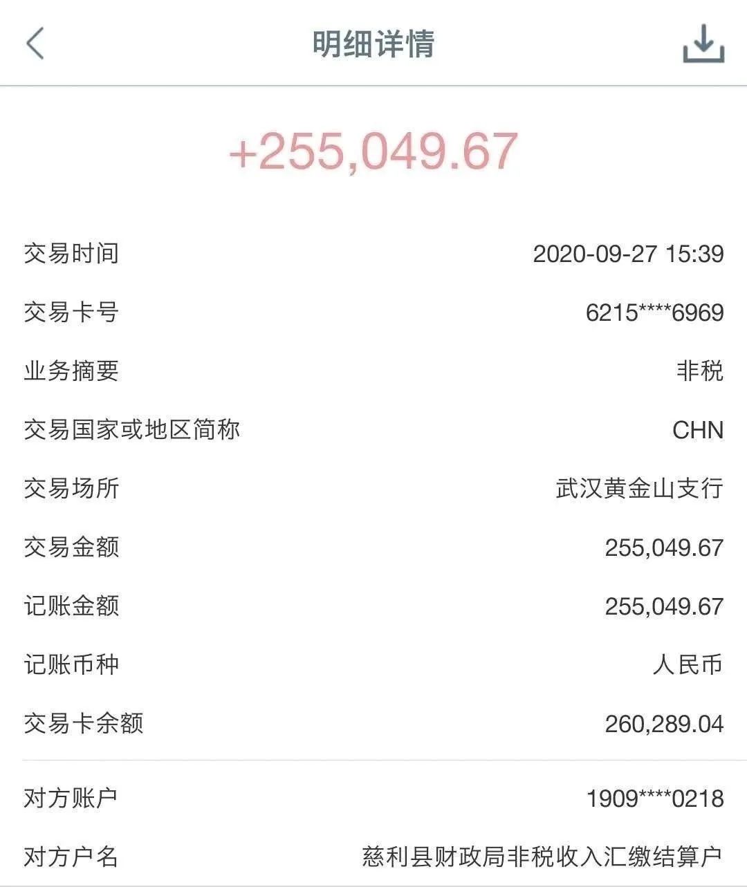 在唐虎被捕的前两天,也就是9月27日,祝某收到一笔255049.67元汇款,汇款方账户名为“慈利县财政局非税收入汇缴结算户”。