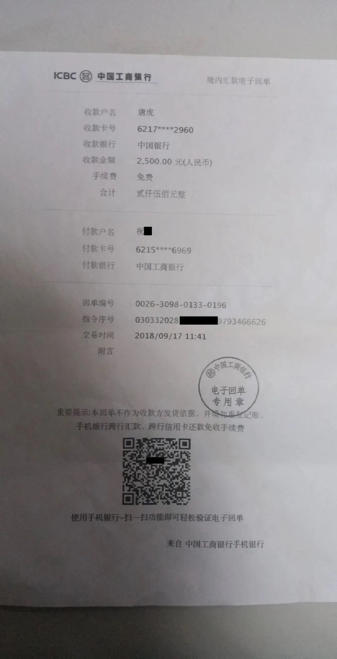 9月25日,祝某与唐虎家人见面并签署了谅解书,唐家人同意全额退回盗刷金额共计255049.67元,并补1万元作为两年的利息。两天后,鲤鱼桥民警杨佳带着祝某到慈利县财政局领取了255049.67元。