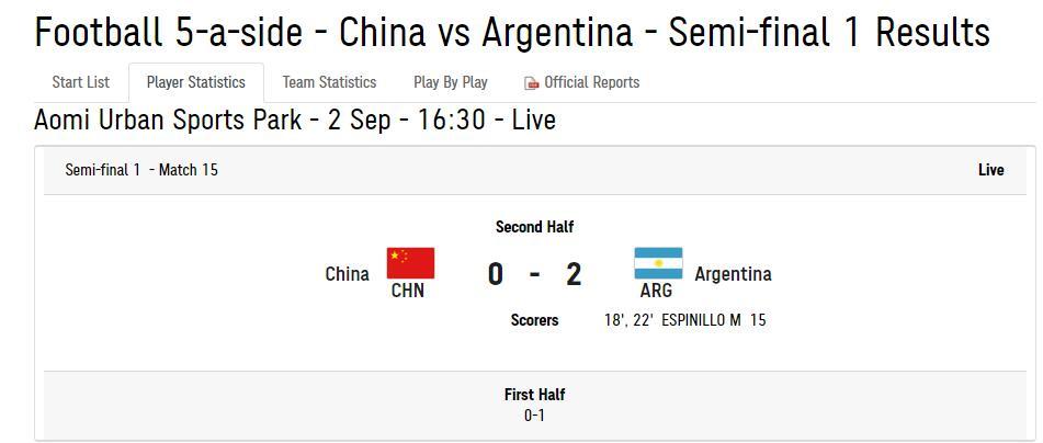 2日下午,在东京残奥会盲人足球半决赛中,中国盲人男足0-2不敌阿根廷队,遗憾无缘决赛。