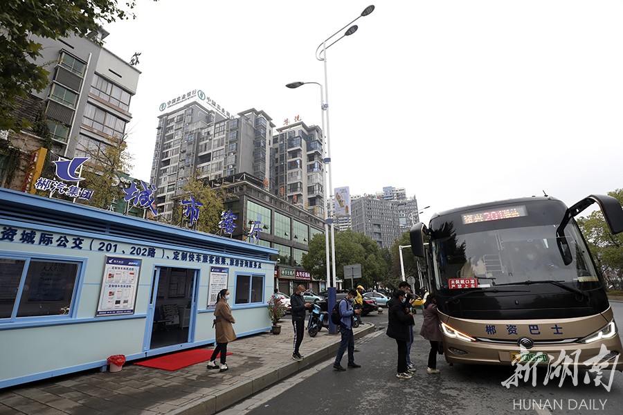 11月15日,资兴市城际公交“城市客厅”,乘客在有序上车。近日,资兴市首个城际公交“城市客厅”正式启用。该“城市客厅”面积不大,但功能齐全,可提供休息座椅、空调、自助购票、茶水、医疗急救等温馨服务,给群众出行带来便捷,提升了城市形象。 李科 摄