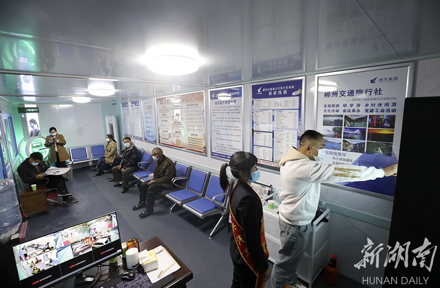 11月15日,资兴市城际公交“城市客厅”,乘客在工作人员的指导下自助购票。
