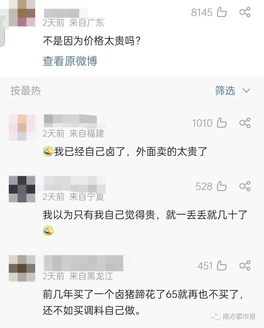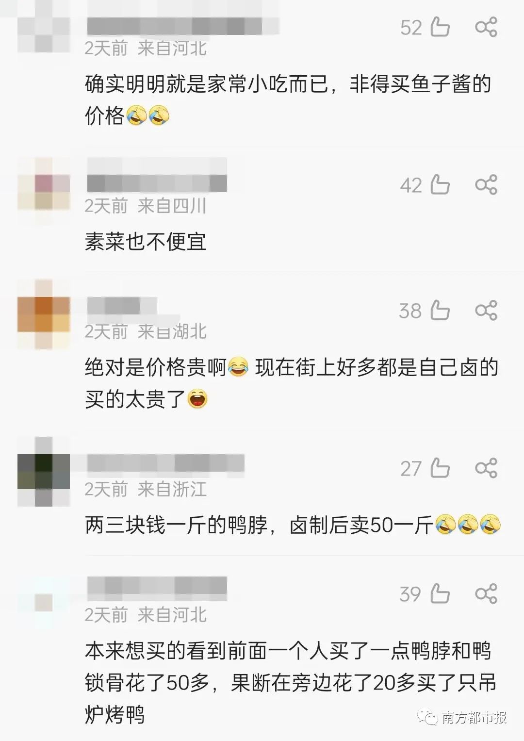 在#鸭脖为何卖不动了#话题下,网友纷纷表示“现在的卤味卖得太贵了”“价格动不动就是大几十块钱一斤,吃不起”。