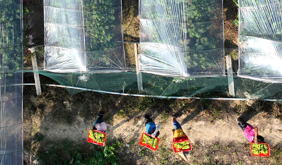 8月5日,衡山县永和乡葡萄种植基地,村民在采摘阳光玫瑰葡萄。夏日时节,该乡种植的葡萄、冬枣、猕猴桃等小水果陆续进入成熟采摘季,当地村民抢抓农时采摘水果供应市场,确保丰产丰收。 曹正平 陈亮 摄影报道