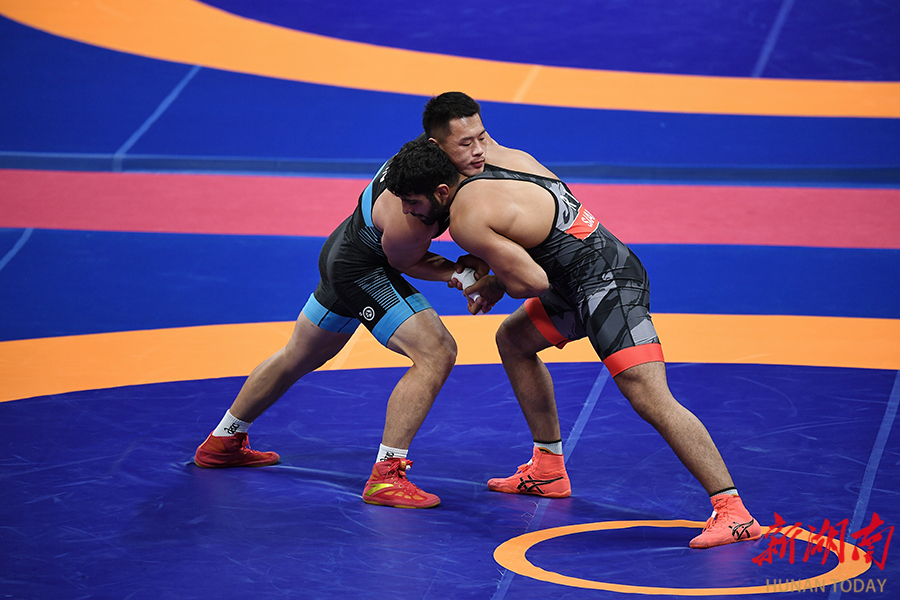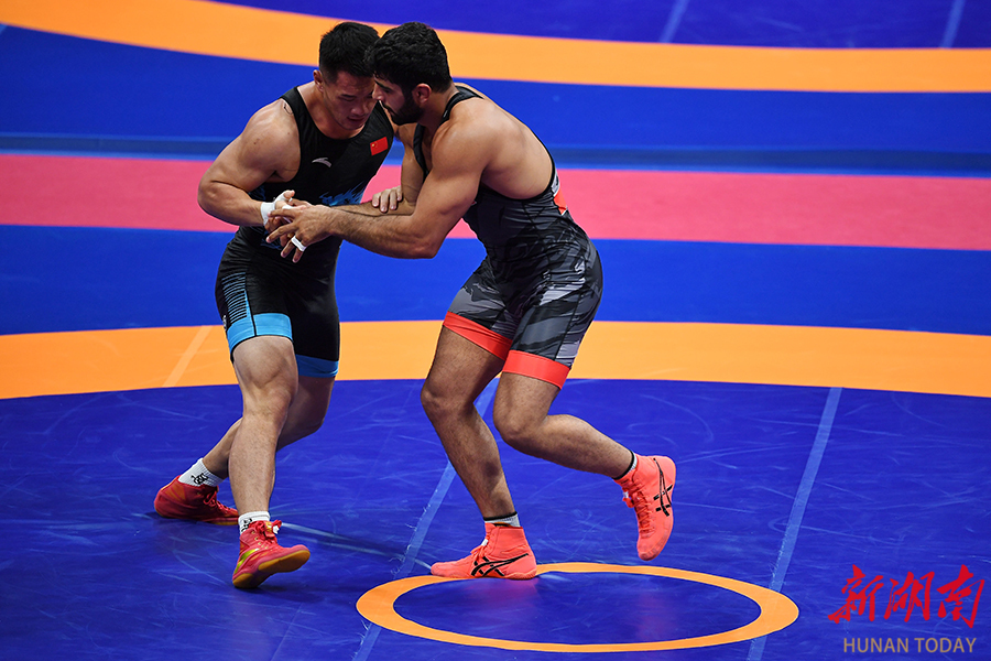 10月5日,在杭州市临安体育文化会展中心体育馆举行的摔跤男子古典式97公斤级项目决赛中,中国选手李一鸣不敌伊朗选手穆罕默德哈迪·萨拉维,获得银牌。图为李一鸣(蓝)在比赛中。 湖南日报全媒体记者 傅聪 摄