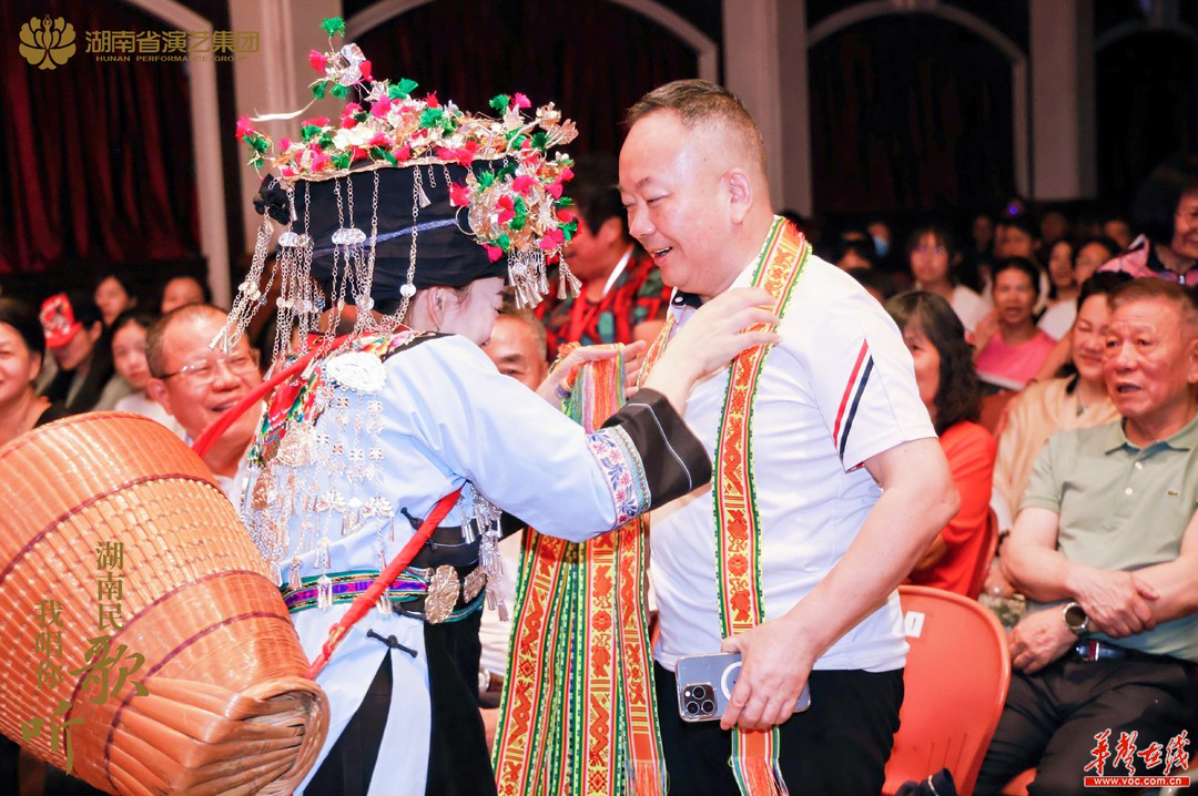(非遗传承人吴廷翠为澳门观众送上苗族花带。图片由湖南省演艺集团提供)