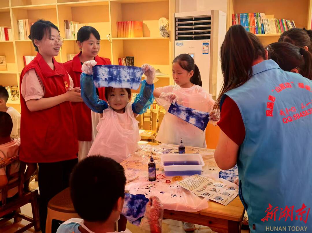下午的课堂,则弥漫着植物染料的独特清香。志愿者金易心将孩子们带入蜡染的世界。当听到“这是咱们湘西苗家的宝贝手艺”时,原本叽叽喳喳的孩子们瞬间安静下来,腰板挺得笔直,好奇与自豪的光亮在他们眼底闪烁。孩子们用橡皮筋、木夹等工具固定布料,再浸入植物染液,不仅观察到色彩渗透的奇妙变化,更收获了独特的美学体验。在染布展开的那一刻,那些白云、花朵、振翅的蝴蝶等独一无二的图案在蓝布上绽放,孩子们天马行空的想象更是引发了志愿者的惊叹。从蜡染到扎染,非遗手艺焕发出新的活力;从学习到制作,孩子们深切感受到传统文化的魅力。