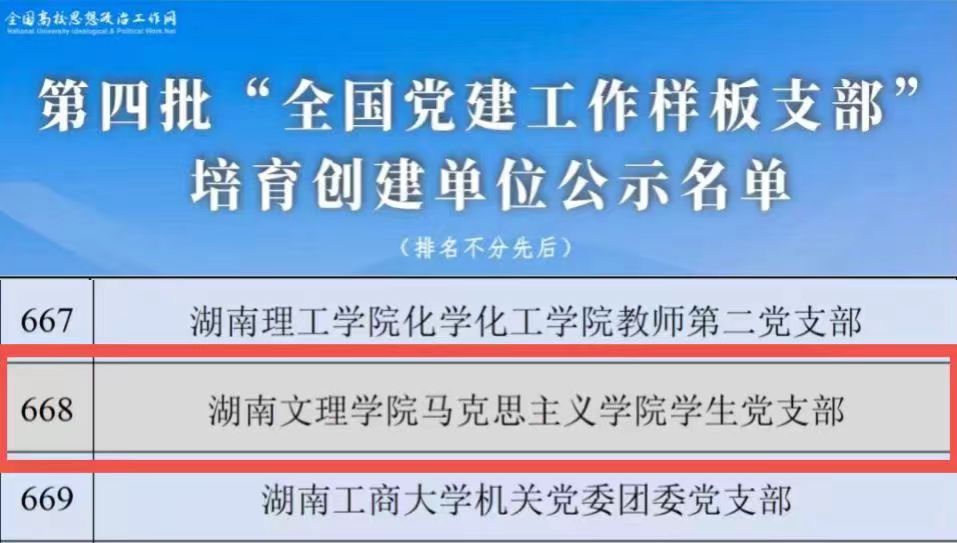 日前,教育部公布了第四批新时代高校党建示范创建和质量创优工作结果,湖南文理学院马克思主义学院学生党支部成功入选“全国党建工作样板支部”培育创建单位。