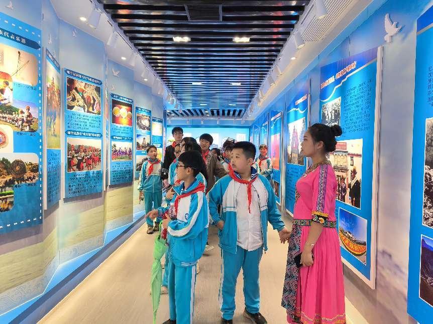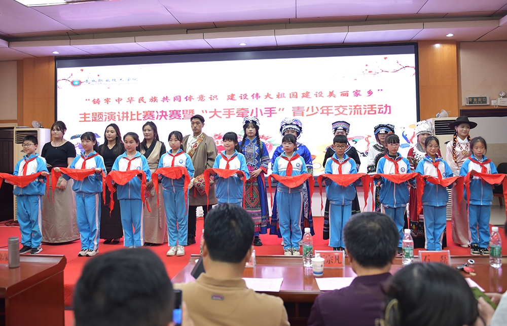在随后的“大手牵小手”青少年交流活动中,娄底市第一小学的20名少先队员们为娄底职院少数民族大哥哥大姐姐系上红领巾,娄底职院学生送上中国结作为礼物,双方一起合影留念。随后,双方手牵手来到学校的民族团结进步教育展览室参观学习,在交流中更进一步感受到了“践行守望相助理念,铸牢中华民族共同体意识”的真谛。(魏玮宏 邓升阳)