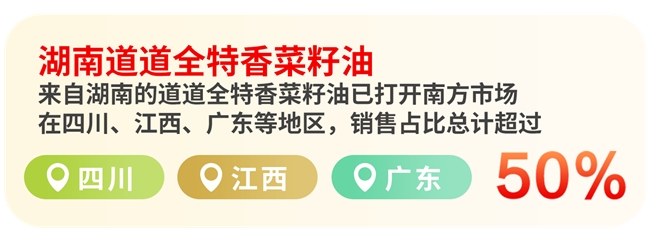 道道全特香菜籽油的销售数据中,销往四川、江西、广东等地区的占比已超过50%,品牌影响力进一步增强。道道全作为湖南优秀本土企业的代表,会一直坚持初心,发挥地方产业优势,与京东超市共同打造地方特色产业标杆,让湖南的 “家乡好味”道道全被全国更多消费者看到。