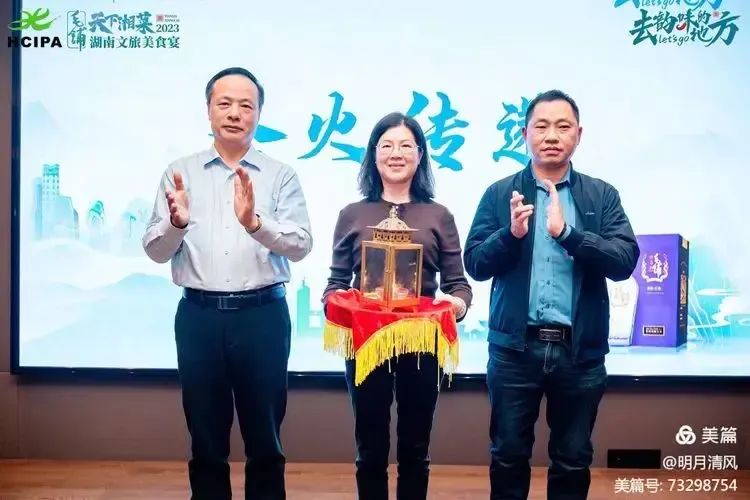 启动仪式上,李平主席(左)、张明清先生(中)向承办“湘西土家十二大碗迎宾宴”的总经理传递湖南衡山祝融圣火。↓