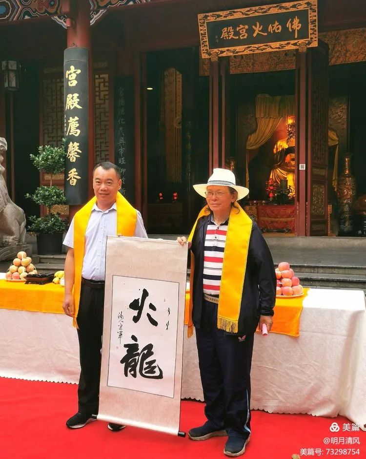湖南省机关事务局原巡视员、著名书法家宋军(右)为火宫殿赠送的书法作品“火龙”,火宫殿餐饮公司周后长副总经理接作品。↓