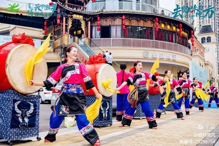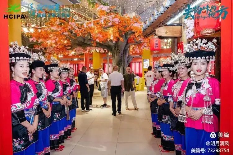 各餐饮店服务员身着民族服装,唱着山歌迎贵宾场景之一。↓