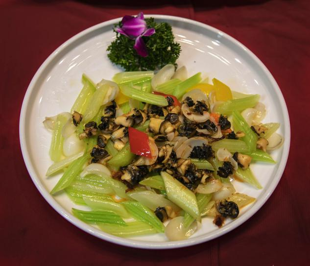 “剪出潇湘一片秋”。秋色月光,淡雅相宜。西芹百合色泽素淡雅致,荤素结合,绿白相间,清甜爽口,素食甜香,螺肉脆嫩。