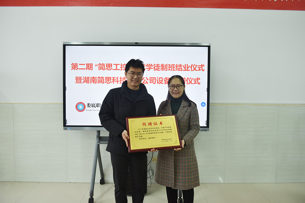 娄底职院党委委员、副校长游新娥给简思工控总经理黄先志颁发“捐赠证书”。