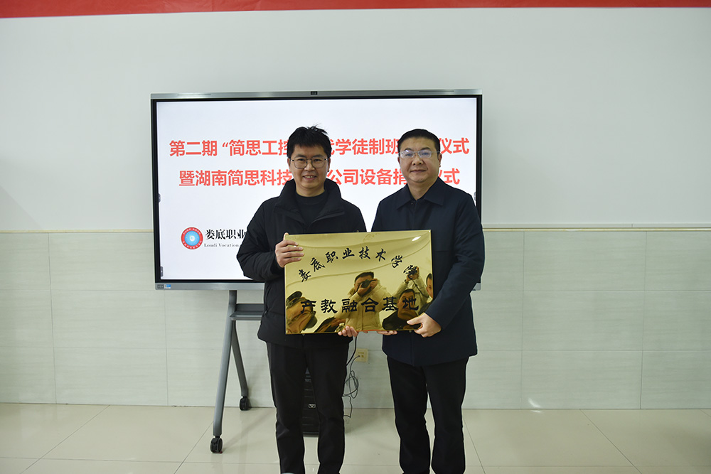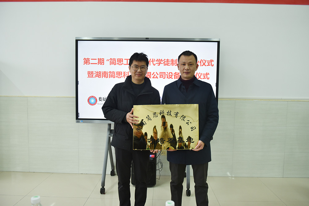 简思工控总经理黄先志授予娄底职院“湖南简思科技有限公司人才培养基地”牌匾。