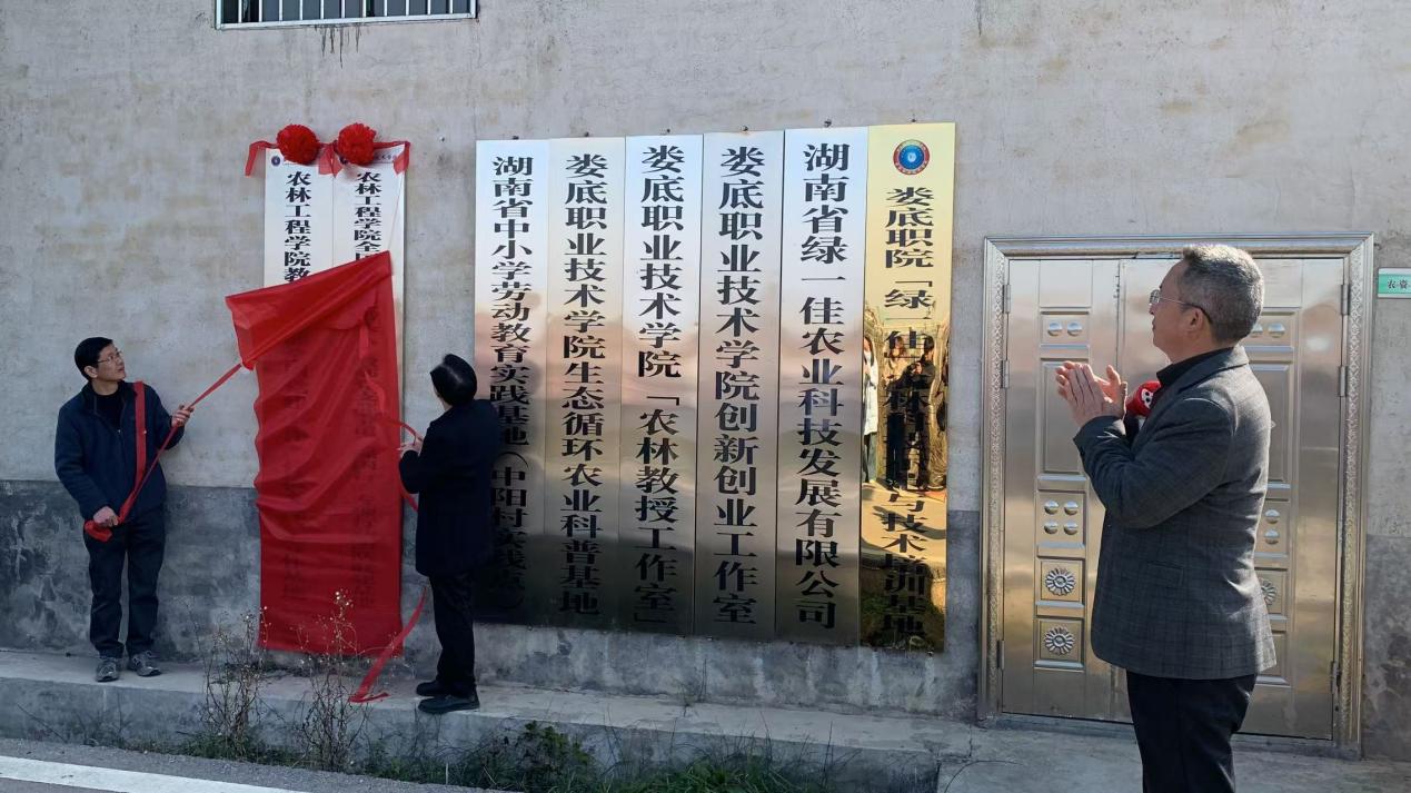 在娄底职院绿一佳农林科技示范与技术培训基地(湖南省绿一佳农业科技发展有限公司),娄底职院组织部部长吴文贵与农林工程学院副院长谢大识共同为“农林工程学院教师党支部全国党建工作‘样板支部’合作基地”“农林工程学院全国高校‘双带头人’教师党支部书记‘强国行’专项行动团队联建基地”授牌。