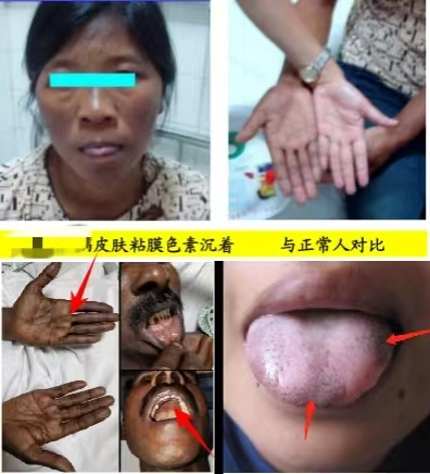 咱先讲讲症状,最显眼的就是皮肤变黑。阿姨为啥变黑呢?这里面有个挺有意思的“小秘密”。咱们身体里有个肾上腺皮质,它本来该正常分泌激素,可要是它“偷懒”,激素分泌不足,垂体就着急了,赶紧分泌更多的促肾上腺皮质激素(ACTH)来督促它干活。巧的是,ACTH 长得和促黑素细胞激素有点像“亲兄弟”,结构相似,结果就误打误撞地刺激黑色素细胞,让它们一个劲儿地合成黑色素,这下可好,皮肤颜色就越来越深,像胳膊肘、膝盖这些经常摩擦的地方,还有乳晕、身上的瘢痕、牙龈、口腔里的颊黏膜,那颜色变得尤其明显,就好像身体被偷偷“抹黑”了一样。