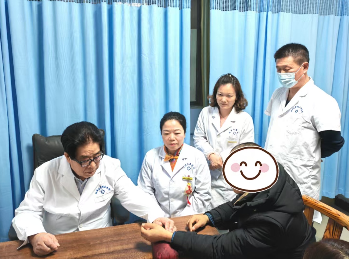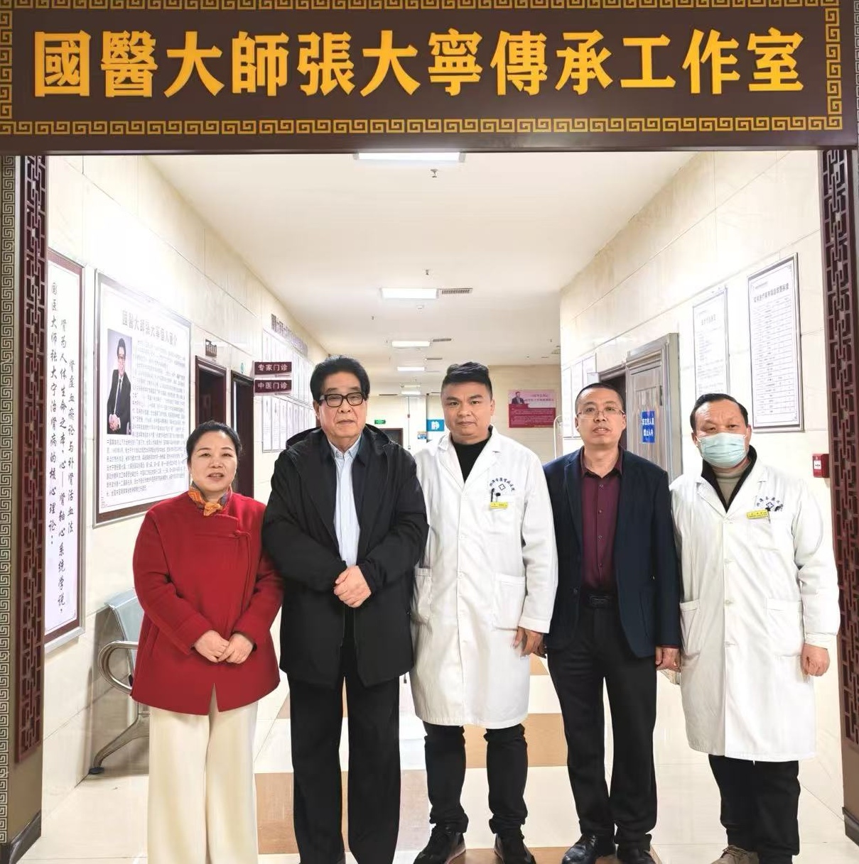 图为国医大师张大宁(左一)和文育红(左二)一起义诊。