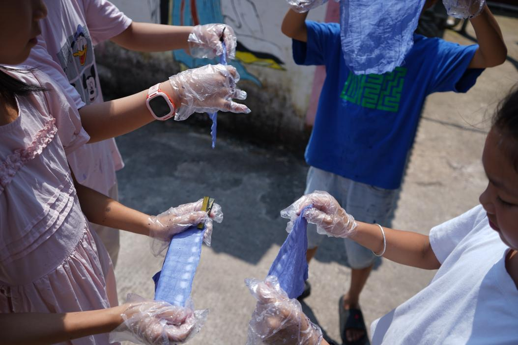 “原来一块白布能变得这么美!”学生尹昱举着自己染好的手帕,兴奋地展示着上面不规则的蓝白花纹。队员方卓表示:“扎染没有标准答案,就像每个孩子都有自己的创造力。我们希望通过这样的课堂,让孩子们感受非遗的魅力,也让传统文化在互动中传承。”