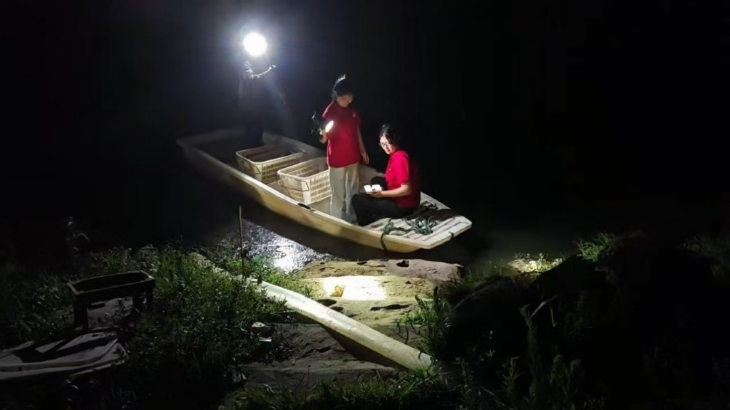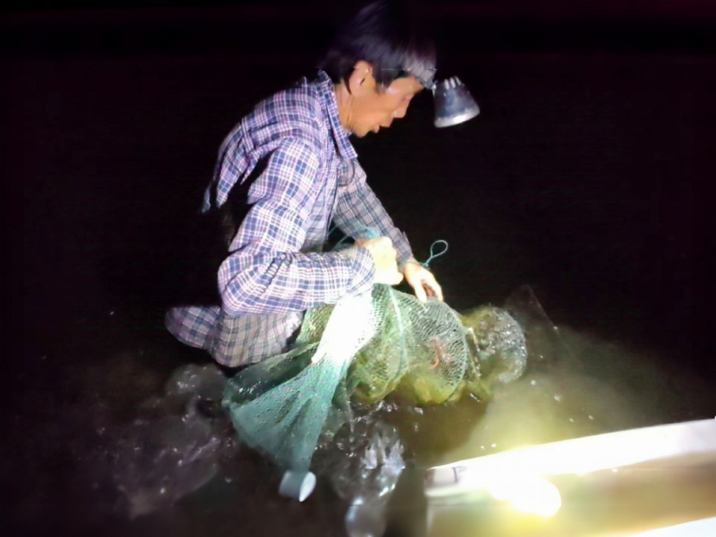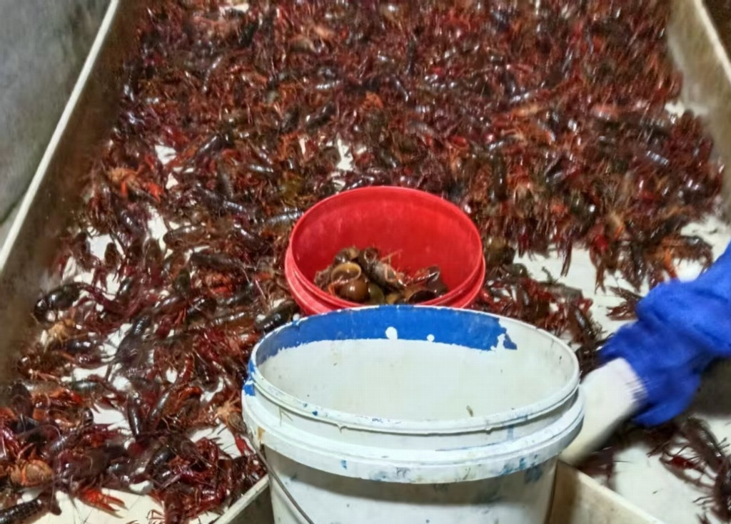 荷香深处虾戏水,轻舟载月捕虾忙。水田边,几盏头灯在黑暗中划出明亮的光束,工作人员贾师傅穿着防水裤,踩着湿滑的田埂,走上水边的白色塑料船,并精准地将船停在地笼标记处。贾师傅利落地下到水中,摸索着找到地笼绳头,弯腰拉起沉甸甸的虾笼,十余米长的地笼破水而出,数百只青壳红螯的小龙虾倾泻而下,在船上的塑料筐里蹦跳翻腾。在荷香与泥腥交织的劳作里,年轻的手掌第一次掂量出“躬耕”二字的真实分量,那不仅是渔获的丰盈,更是大地对求知者最质朴的授业。