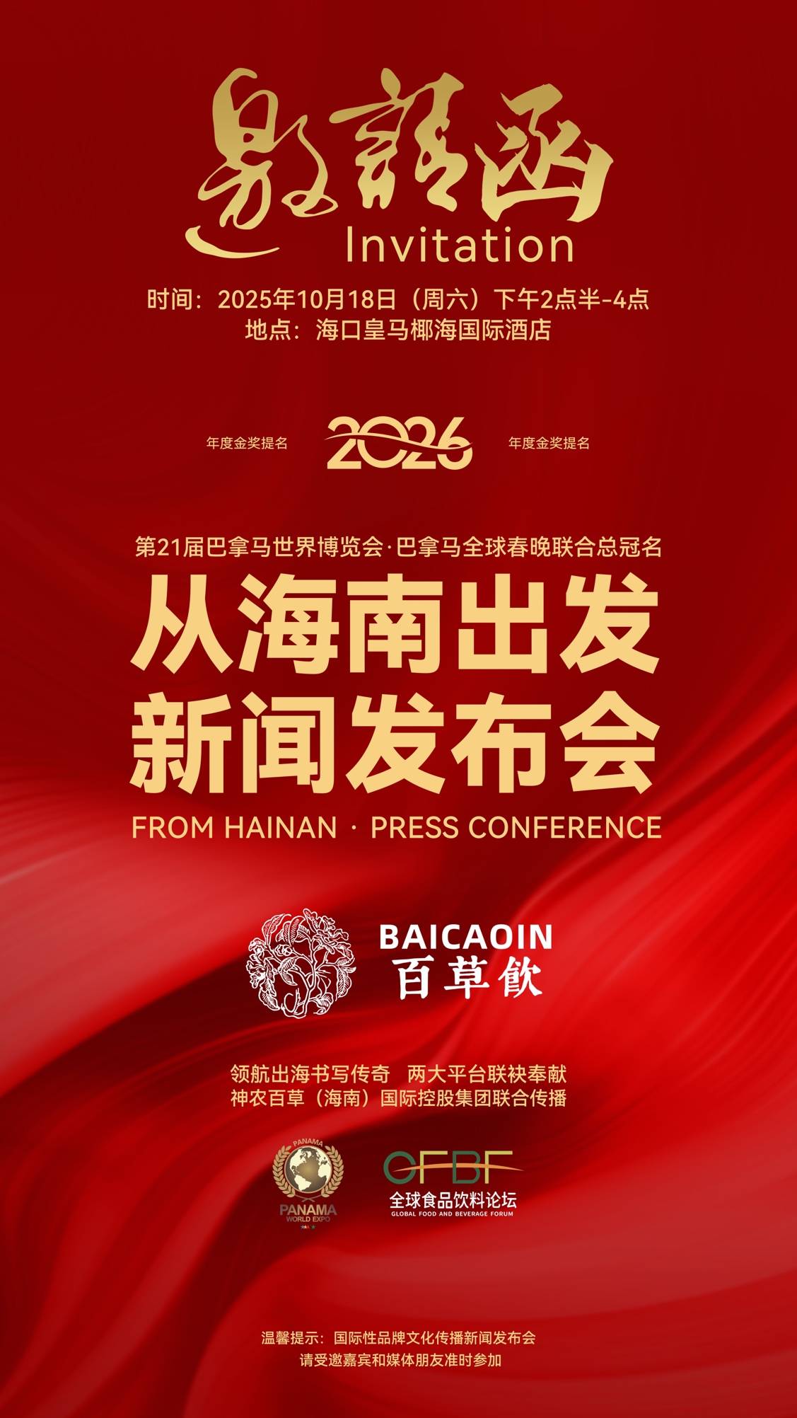2026·第21届巴拿马世界博览会·巴拿马全球春晚活动将在2026年2月 “中国年新春佳节”期间在巴拿马共和国首都巴拿马城隆重举办。巴拿马世界博览会国际组委会传播团队将对「百草饮」产品进行一系列高规格世界级包装和推广,并将为神农百草(海南)国际控股集团「百草饮」品牌产品设计制作价值过百万、全球最先进的数字实景博览馆和数字实景展厅,面向海内外进行产品推广传播。