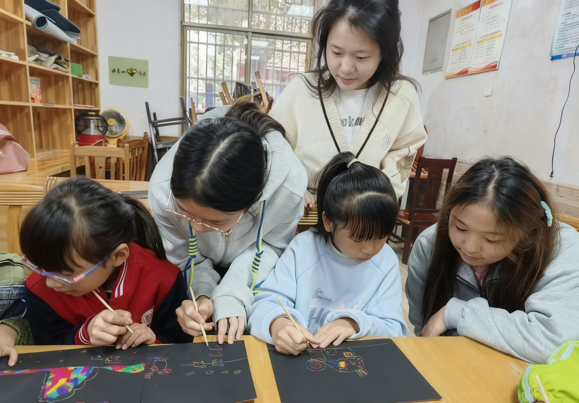(通讯员 林洪淼 杜柏衡 周雨晴)“我画的是‘小荷才露尖尖角’,你看,蜻蜓正从荷叶里钻出来!”10月25日上午,在长沙市岳麓区石门楼社区新民小区活动中心,一位身穿绿色上衣的小男孩一边在刮画纸上涂抹,一边兴奋地向身旁的志愿者讲解自己的创作。这一幕,发生在湖南师范大学文学院区校共建部举办的“向美而行,滋养童心”美育实践活动现场。在该活动中,大学生志愿者带领社区儿童聆听古诗词配音朗诵,并用刮画纸展现心中诗意。活动开始,室内灯光微暗,《小池》、《悯农》等五首经典诗词的配音朗诵缓缓响起。志愿者引导孩子们闭上眼睛,尽情想象诗中的画面。聆听环节结束后,志愿者为孩子们分发了黑色刮画纸与木笔。随着黑色表层被轻轻刮开,底层的彩色世界逐渐显露,现场响起一片“哇”的惊叹声。