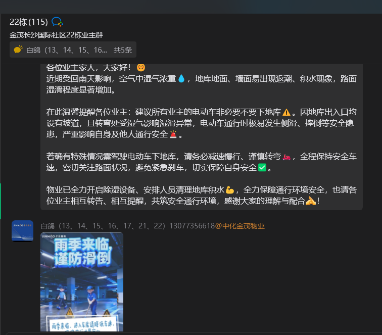 长沙金茂湾的聂师傅面对近90天的阴雨天处变不惊,“长沙的天气总是具有挑战性。”他开玩笑地说道。这天早上,聂师傅按常规检查地库除湿机运行情况,他介绍说长沙金茂湾地库保持干爽的秘密武器就是它,只要湿度达到80%它就会自动开始除湿。在长沙金茂国社、长沙金茂苑等项目,秩序团队正在检查地库挡水板是否完好,防汛物资是否到位,客服团队及时提醒业主注意雨天出行防滑。