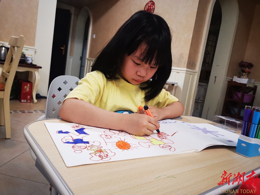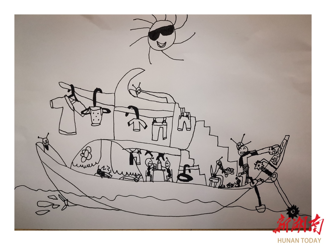 平常,橘子还喜欢绘连环画。利用“奥利奥熊猫饼”包装纸上图案,找出关联的图片,画《小熊家族日记》系列。日记体绘画描述小熊一家老小,搭车、乘船、坐地铁去常德水上游乐场(她爸妈曾带她去常德等玩过)和超市购物一路上所见所闻,她编绘的故事,基本上能做到自圆其说。