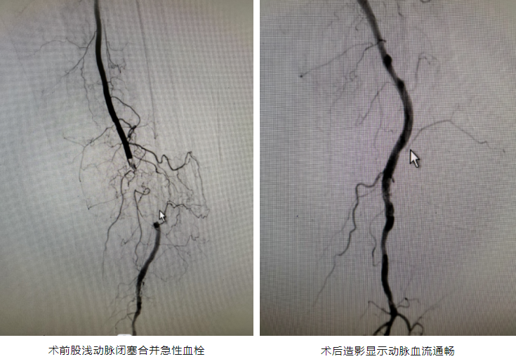 针对患者病情,我院放射科副主任张堃立即组织多学科会诊,制定详细手术方案。6月21日清晨,血管肿瘤介入科谢太喜副主任医师、程瑞文主治医师和曹亚衡主治医师在局麻下为患者先行“下肢动脉造影+溶栓术+血栓抽吸术”,术后疼痛明显减轻,肢体皮温部分恢复。